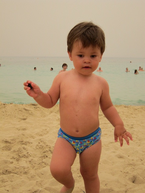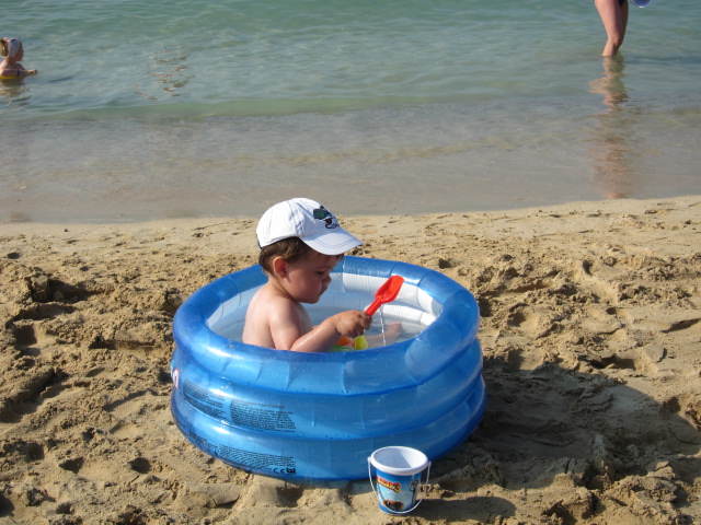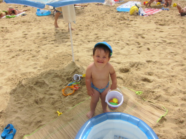 8.30 Располагались на лежаках, далее брали весь инвентарь (круг, надувной бассейн, мячики, водный пистолет, лопатки, ведерки и.т.д.) и к морю (идти до моря 3 минуты). Около моря лежаки платные, так как пляж муниципальный, но нам они не сдались совершенно, потому что в трёх минутах ходьбы были лежаки нашего отеля. Поэтому на пляже стелили циновку и раскрывали свой зонтик и до 12.00 копали, пекли куличики, строили замки, собирали камушки и бросали их в воду, стоили крепость и очень много плавали.
