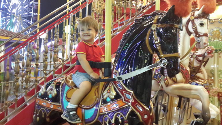 После ужина брали из номера нашу колясочку и шли гулять по городу. Родька с интересом разглядывал все вокруг. Много раз были в местном лунапарке. Теперь Родюха умеет кричать лошадкам «нёёёёёёёёёё». А вот и фото храброго наездника: