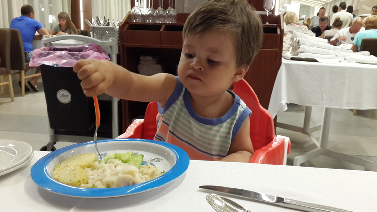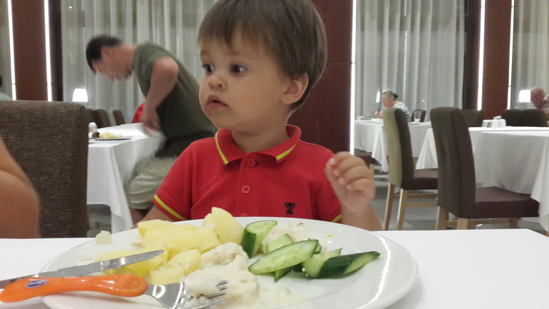 13.15 Обед. Всё было очень и очень вкусно. Единственное хочу отметить, что как такового детского стола в отеле нет, поэтому для деток-аллергиков придется что-то придумывать. Правда, как я говорила, утром есть овсяная каша, а на ужин всегда есть детский супчик. Мой ребенок трескал всё и с удовольствием. Естественно я не давала ничего жирного, жареного, с соусами. Кушал отварную и запеченную картошечку, рис, макароны, индейку, рыбу, говядину, курицу, огурчики. В общем, я всегда находила то, что можно дать ребенку. Проблем никаких не было! Что касается шведского стола, в целом, то он был очень разнообразен. На обед всегда был разный суп, несколько видов рыбы, говядина, свинина, всевозможные гарниры и салаты, овощи, фрукты, десерт.