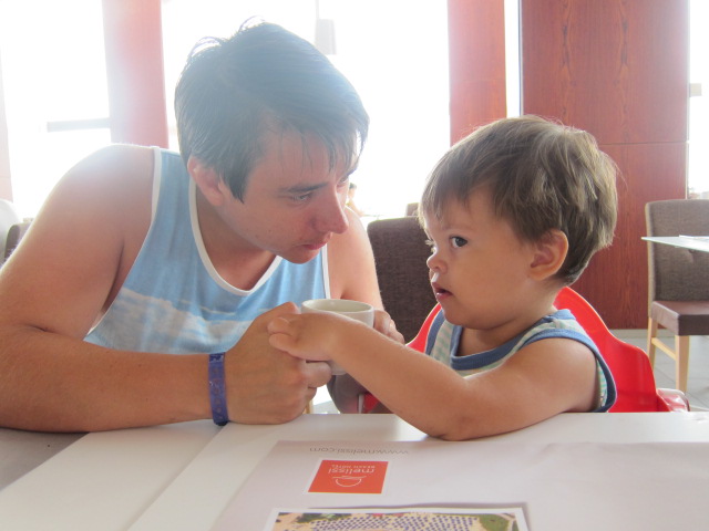 Ну это было лирическое отступление, а теперь собственно про отдых. Вылет был в 6 утра, соответственно из дома мы выехали около 3 часов ночи. Вопреки моим ожиданиям, Родиона совершенно не расстроило столь раннее пробуждение и в такси он мирно смотрел в окошко и попивал сок. В аэропорту все предполетные процедуры прошли стандартно и уже в 5.30 мы сидели в самолете. Мои надежды на то, что Ролька в самолете поспит не оправдались. Столько нового и интересного вокруг! Когда ж спать-то!!! Взлетели, поели, попили, клеили наклейки, катали любимую пожарную машинку, разукрашивали водную раскраску и уже посадка. Лететь всего 3 часа, поэтому время прошло очень быстро. В аэропорту Ларнаки очень долго ждали нашу коляску, такое ощущение, что у них там не один борт за час приземляется, а 100. Прям Хитроу блин!!! Зато до отеля доехали очень быстро и уже в 11 утра готовы были заселится, но, к сожалению, даже за дополнительную плату заселиться раньше. 14.00 не получилось, так отель был заполнен полностью. В принципе, 3 часа - это не так долго, конечно. Погуляли по территории отеля, пообедали и пошли заселяться. Отель Мелисси Бич в Айа-Напе меня устраивает полностью.