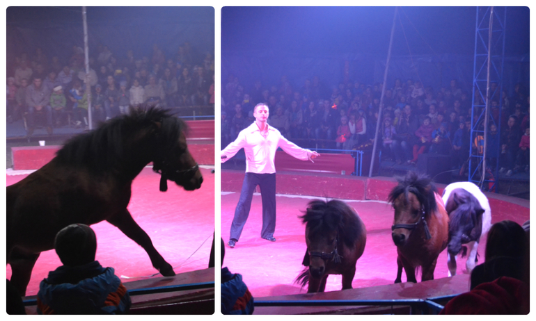 Наконец то, дождавшись начала представления, я еле усадила Даню на руки. Первой выступала гимнастка показывала акробатические трюки под куполом цирка на двух длинных отрезках ткани. Она так ловко обворачивалась ткань вокруг своего тела, и резко срывалась без страховки вниз, удерживаемая той же тканью. Зрелище было очень эффектным, но я видела все одним глазом, Данил ни как не хотел сидеть и смотреть представление, а все норовил слезть с рук. А моей огромной радости на смену гимнастки пришли три цирковых пони.