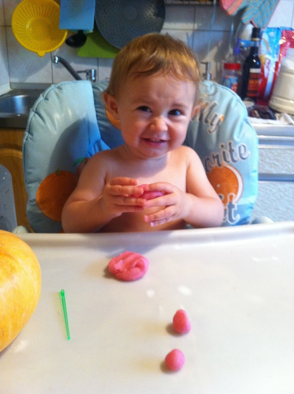 Также за последний месяц проснулась любовь к пластилину и мелкам. Из теста Ника катает колбаски, отрывает кусочки, катает колбаски, тыкает пальчиком. Мелом же разрисовывает все поверхности в квартире)