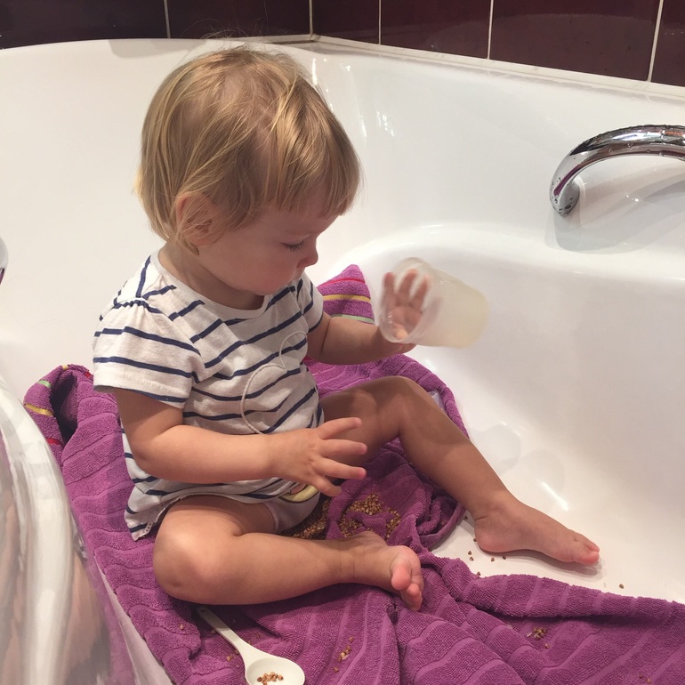 Готовлю теперь на полу, потому что человеку очень интересно, что происходит. Пощупать, потрогать, попробовать на зуб, налить воды, насыпать муки. Масштаб катастрофы после наших совместных блюд на удивление мал)). Я-то думала, что мне придется после этого драить всю квартиру.