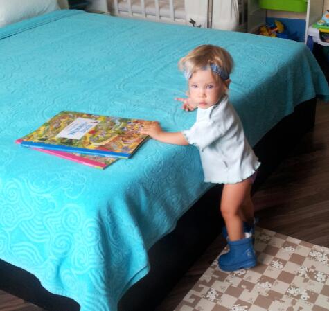 Поет все время: утро начинается с песни, ночью поет, засыпает - поет, на качелях поет. С кровати сняли одну перекладину - теперь можно самой вылазить, что и делает. Я как-то утром проснулась от взгляда, а это юля вылезла и молча смотрит на меня - ждет.