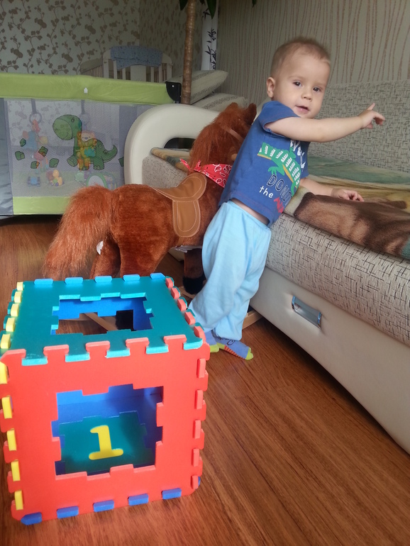 Во время игры если игрушка закатились под диван, манеж или под стол, сразу наклоняется или вообще на пол ложится и смотрит куда от него игрушка убежала. Если сам достать не может подходит ко мне и показывает пальчиком "мол мама, достань"))) Любит очень купаться в ванне, бывает прям с криками его от туда достаю) Научился собирать пирамидку, не прям сам берет и собирает. Я даю ему колечко или он сам берет и надевает, правда еще не всегда попадает, но прогресс пошел. В уточку-сортер в дырочку опускает яички пластмассовые! Любит играть с мячом очень, складывать и вынимать игрушки из пакета. Показывает носик и глазки и мягких игрушек. Если ударится головой, начинает чесать то место ручкой) Очень любит заворачиваться в шторы и тюль как в кокон, при этом визжит от восторга) Все жду когда он мне эту тюль оборвет