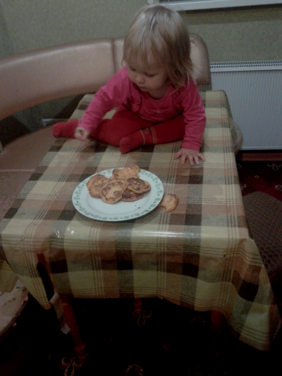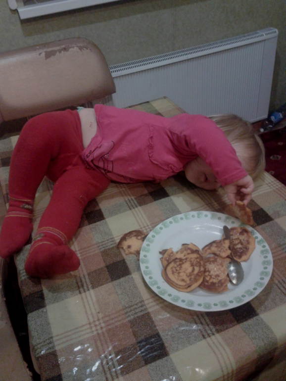 Ника сидела на столе и ела оладики,при этом все их понадкусывала.Мы конечно испугались(могла бы и упасть),но выглядело это очень смешно.Она их жувала и что то припевала.А потом когда доела стала говорить баю- бай и улеглась на стол.
