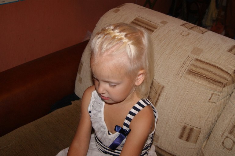 вот так и делала, ободочком, не держится долго все равно как фея растрепка((( забираю из сада-кое как заплетена после тихого часа, волосы рассыпчатые очень, а пользоваться муссами принципиально не хочу