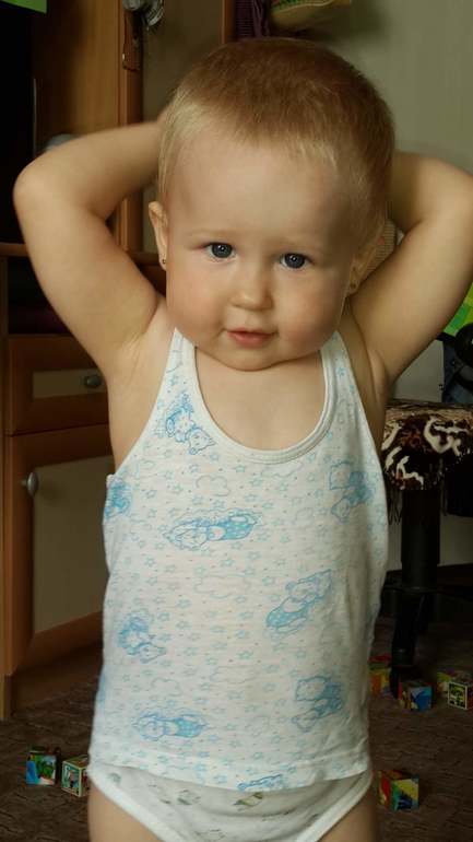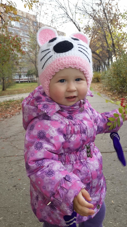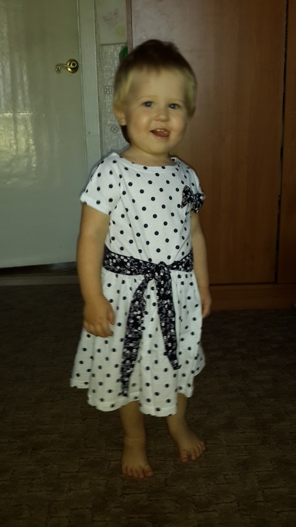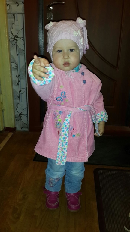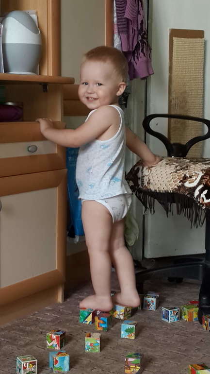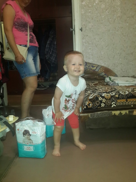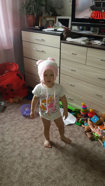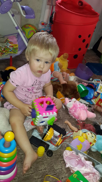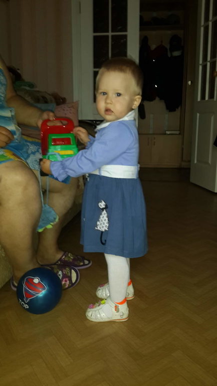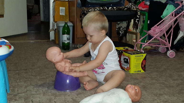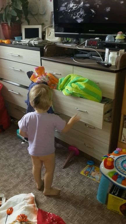 Если берёт что-то, то потом по просьбе несёт и кладёт туда, где взяла. Складываем и вынимает свои вещи из комода. Научилась одевать шапку, снимать рубашонку...и пару раз получилось надеть трусики)))