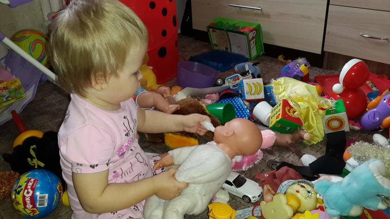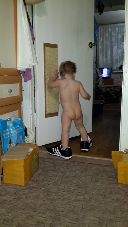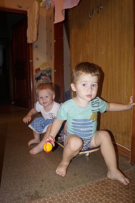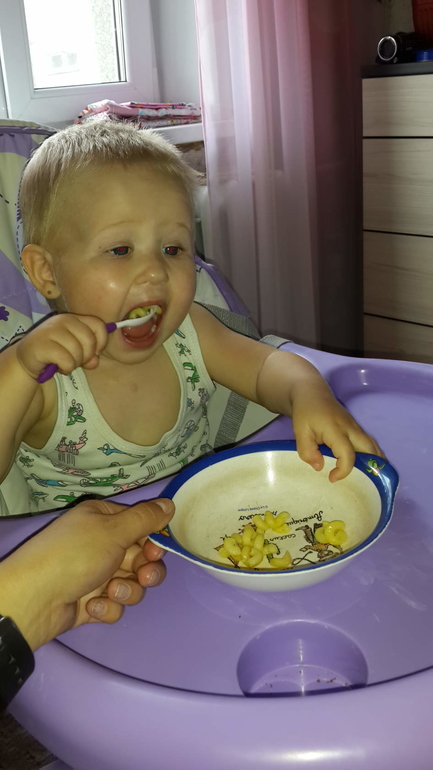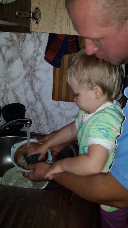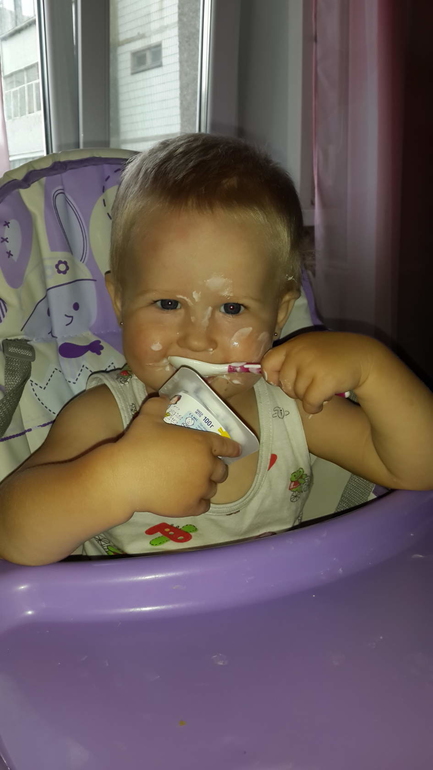 После утреннего пробуждения...идём греть завтрак...попутно нагружаю её двумя пустыми коробочками от биолакта. Пусть учится убирать за собой с детства. Так же носим свою тарелку после обеда. И приносит тарелку старшего брата. Ухаживает умничка!