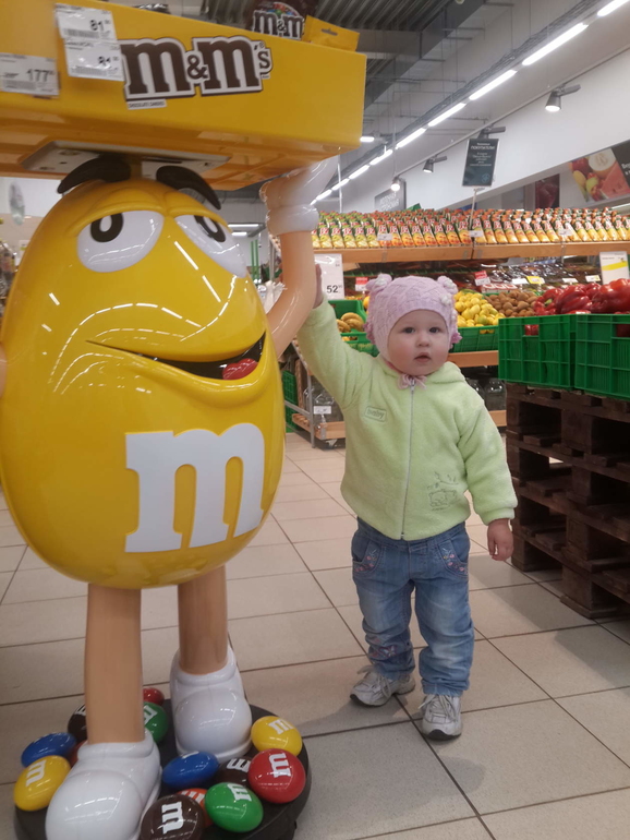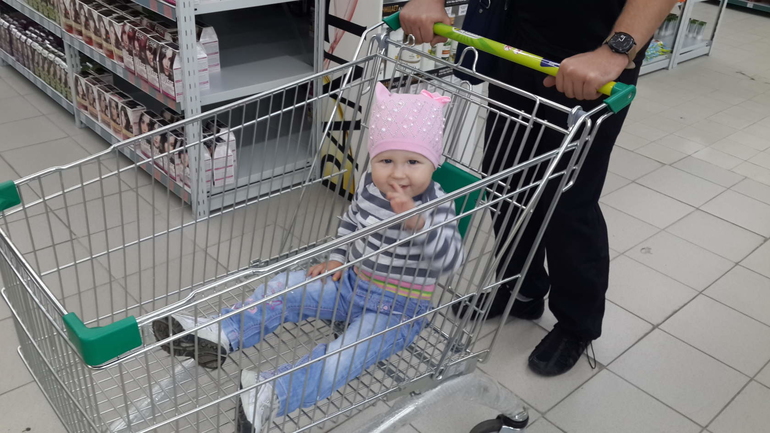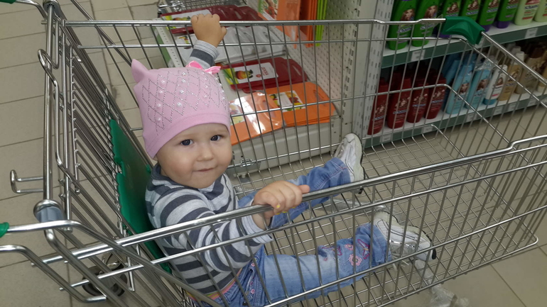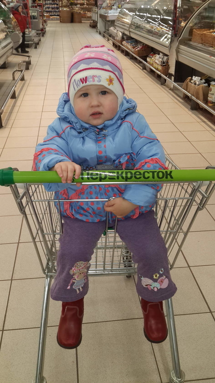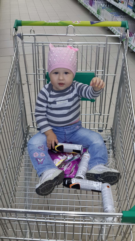 Любит ходить в магазин. Таскает пустую корзинку и накладывает в неё всё, что только попадётся под руку. Сейчас мы возим её в тележке))))