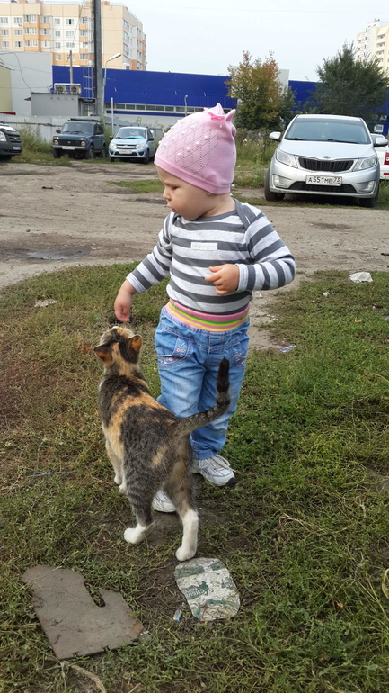 Если видит на улице кошку или собаку,то всё...дитё не оттащить. Поэтому на улице постоянно в поисках какой-нибудь живности)))