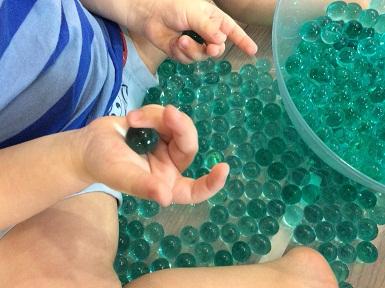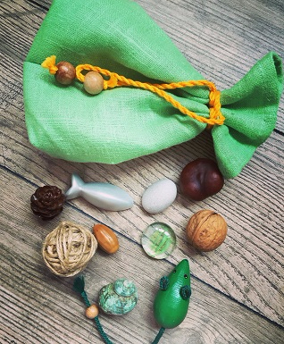 А также развиваем телесно-кинестетический интеллект - восприятие мира всеми пятью органами чувств. Задача игры - на ощупь находить различные предметы. Постаралась собрать разные по фактуре и качествам. В очередной раз убеждаюсь, насколько умна мать природа. В детях изначально все есть, их не надо ничему учить. И как с годами мы утрачиваем все эти способности. Мишка не задумываясь вытаскивал нужные предметы, а я включала логику, оценивала размер, свойства гладкий-шершавый, стеклянный-деревянный и т.д. Несколько дней играли всей семьей.