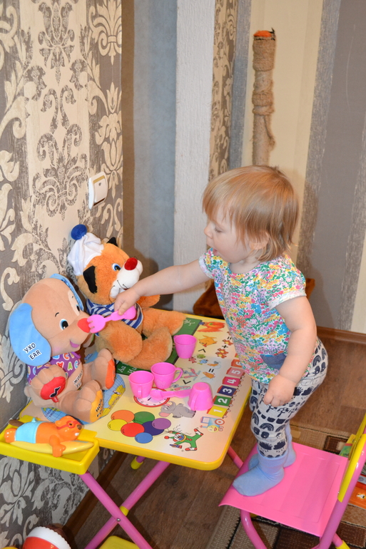 Дашуля у нас помощница растёт, тряпочкой со стола вытирает, помогает бельё развешивать, пыль вытирает, полы моет, когда я подметаю, сразу за совочком бежит и подставляет мне) Очень любит "порядок наводить" на полках с вещами