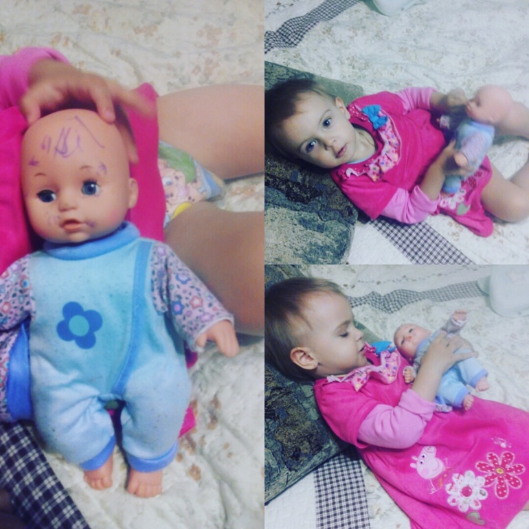 Растем и развиваемсяЮляшик растет!Уже 1г8м!Не верится,после полутора лет время проскальзывает сквозь пальцы. Юлечка у меня большая умница.Во-первых она привыкла к братику,если он плачет подходит качает люльку приговаривая: "АААА-пи",перестала его оттаскивать от меня когда кормлю.Целует его,обнимает.На фоне этого всего у нее любимая игрушка пупс.Укачивает,спать укладывает,поет песни,укрывает одеялком,а вчера пыталась накормить сисей,то одну пристраивала,то другую.Мамочка моя маленькая.