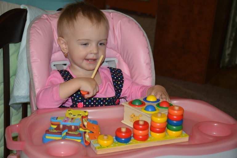 До сих пор любит мультик "Машу и медведь". Для меня он палочка выручалочка. включаю на тот период когда надо или убраться или кушать приготовить. Также накупила кучу ей деревянных игрушек. В полном восторге мы с ней от них. начали изучать цвета,счет.Считаем пока сами до 5, цвета не называем ,но раскладывает при игре в сортировку сама.Также начала по-тихоньку собирать деревянные пазлы,знаете такая дощечка а там например животные разных размеров и форм,и надо правильно пристроить в каждое свое окошко.