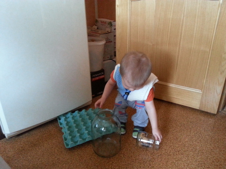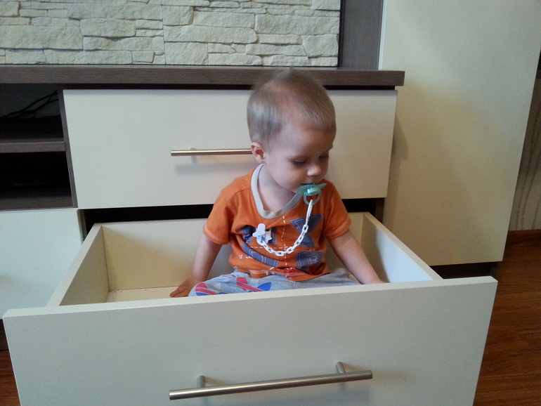 -давно уже открывает везде ящики, но теперь научился в них еще и залазить) при чем сначала вытащит все что там лежит, залазит и тянется к телевизору, который на стене висит, один раз даже получилось его выключить (там сенсорная кнопка), так же научился и слазить от туда;