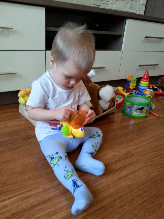 -есть игрушка у нас "руль", так вот научился сам нажимать на нем кнопочки и слушать звуки разные и музыку) но это касается не только игрушки, но и пульта))) Кстати у пульта научился открывать заднюю крышечку и доставать батарейки, а потом пытаться вставить их обратно;