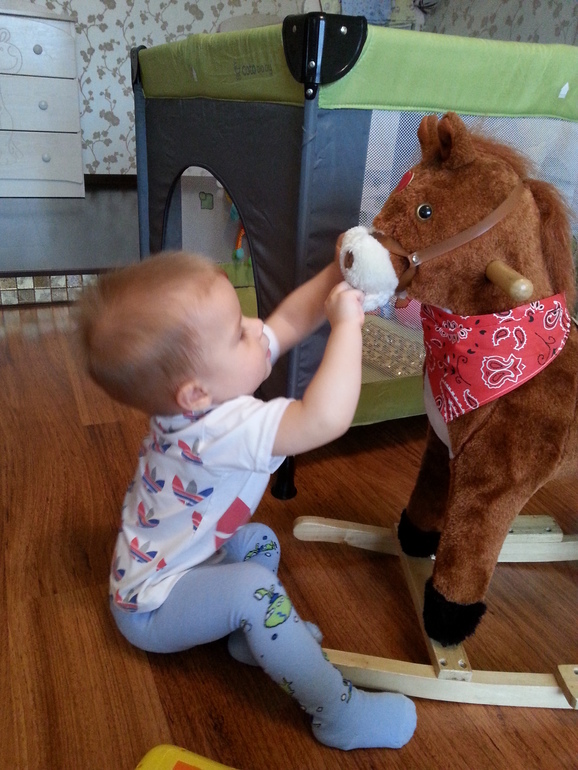 -при слове "лошадка", бежит к своей лошадке-качалке и начинает ее качать, как будто скачет на ней, и научился нажимать на ее ухо, а там сразу песенка начинает играть;