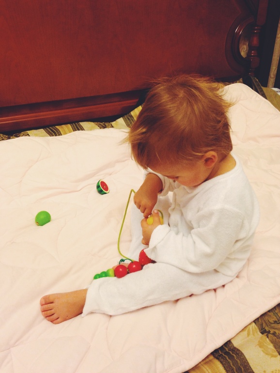 Шнуровку осваиваем, нравится занятие...минут на 5, а потом летят деревянные фрукты куда-нибудь на пол)) Кот любит их погонять )))