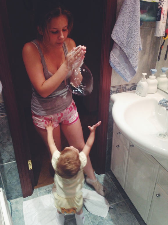 А после - шоу мыльных пузырей)) Я даже не знала, что Катя умеет пузыри огромных размеров прямо руками выдувать! Очень веселое зрелище!!!