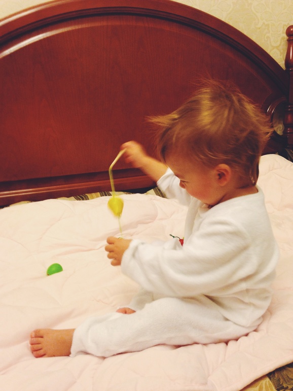 И это только то, что случилось запечатлеть на фото/видео... Затем девчонки коврик из пазлов собирают, занимаются гимнастикой)) "легли на спину", " ноги вверх!" - командует Катя, а Соня смеется и повторяет за ней, "тянем шею"))) Соня тянет, кряхтит ))) книжки почитать, на осле поскакать, слонов индийских перебрать (сувенирные), Лего собрать/сломать, грибочки на пенёчки усадить, "мягкие кирпичики" построить/погрызть/разбросать/собрать, в свистульку посвистеть, мяч погонять, прищепки прищепить)) сто дел, сто дел.. Ой, чуть про пластилин не забыла - он у нас после рисования на втором месте по востребованности))) сегодня правда ели его больше чем лепили)) Вот такая программа воскресного дня :) А вы как проводите время после заката солнца?))