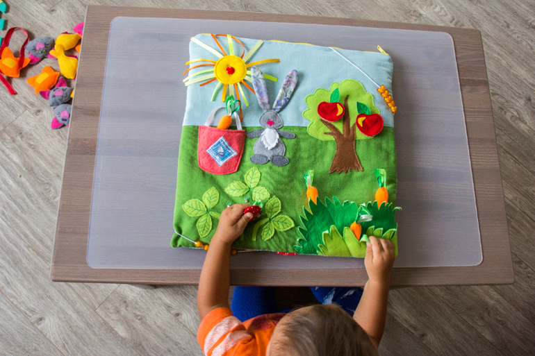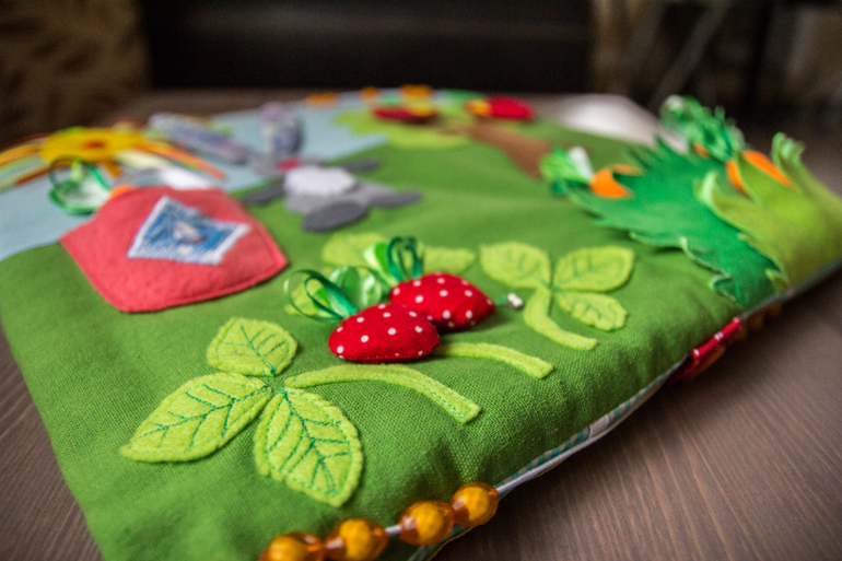 Все сделано своими руками! Каждая деталь - рабочая, т.е. с ней можно проводить ребенку какие-то манипуляции, развивая и мелкую моторику, и логику, и фантазию.Малыш учится строить приятно-следственные связи! А заодно и весело проводит время. На нашей картинке-подушке живёт заяц, который имеет свой сад-огород, на котором мы собираем урожай в виде ягод, яблок и морковки! Всеми этими дарами природы мы кормим своего зайца, и ещё запасы складываем ему в сумку-корзину. Можем менять погоду с солнечной на облачную, потому что наше солнце пуговкой пристегивается к небу! Что тоже позволяет придумывать варианты игр! Игрушка очень занимательная, сыну очень понравилась!Подушка имеет очень увлекательную оборотную сторону, которую покажем отдельным постом, уж шибко она тоже красочная! У кого есть сомнения в таких вещах, как развивающие подушки/книжки, могу сказать с уверенностью, что они на все 100% смогут увлечь ваших деток, и добавят в ваши игровые будни новые интересные занятия!