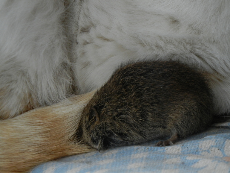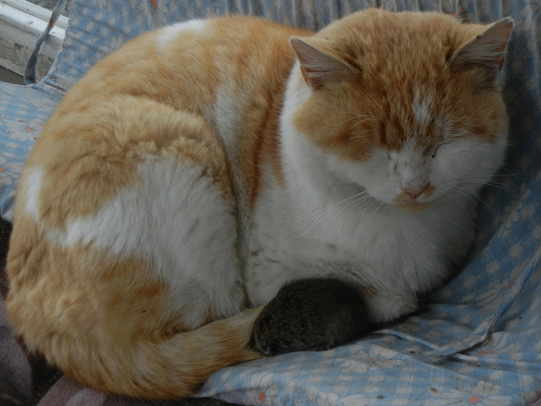 Я успела сфоткать на телефон - сбегать за фотоаппаратом в дом - увидеть, что сели батарейки - сбегать поменять батарейки - убедиться, что они тоже нерабочие - сбегать за другим фотоаппаратом... Потом пришёл муж, тоже обалдел, тоже сделал фотосессию... В общем, через полчаса в окно наблюдали, как кот пытался отодвинуться, но мышка, наверное, всё равно подползала))) В итоге кот просто отвернулся))))