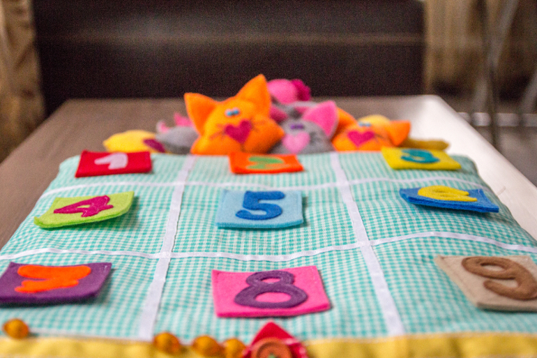Про первую сторону я уже писала (на ней огород с зайцем, которого мы кормили, и солнышком), а вторая сторона представляет собой поле из цифр. На этом поле все цифры съемные, они лепятся на липучки, и их легко поменять местами, или просто отклеить. Задания для ребенка могут быть самые разные: найти нужную цифру, разложить верную последовательность, исправить ошибку в последовательности.