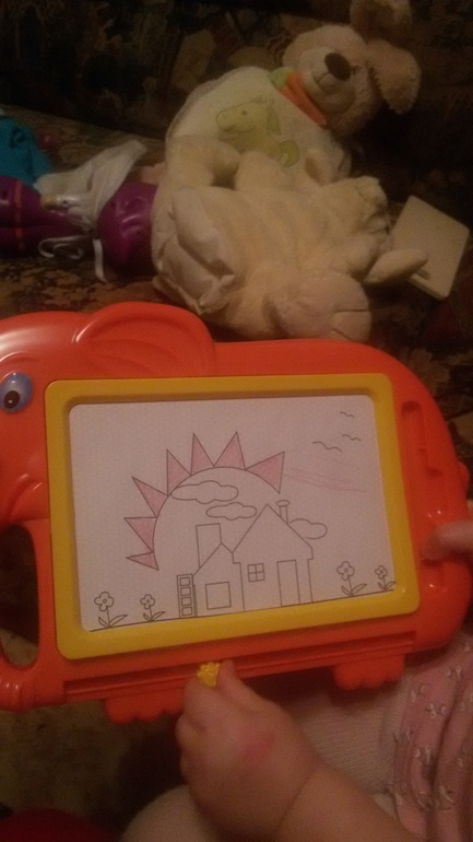 Это графическая доска.Вот там где пальчик правой руки ребенка на фото, в той выемке должна была быть ручка, ей рисуете на поле. Желтым ползунком, который держит ребенок, стираете. И так бесконечно))))