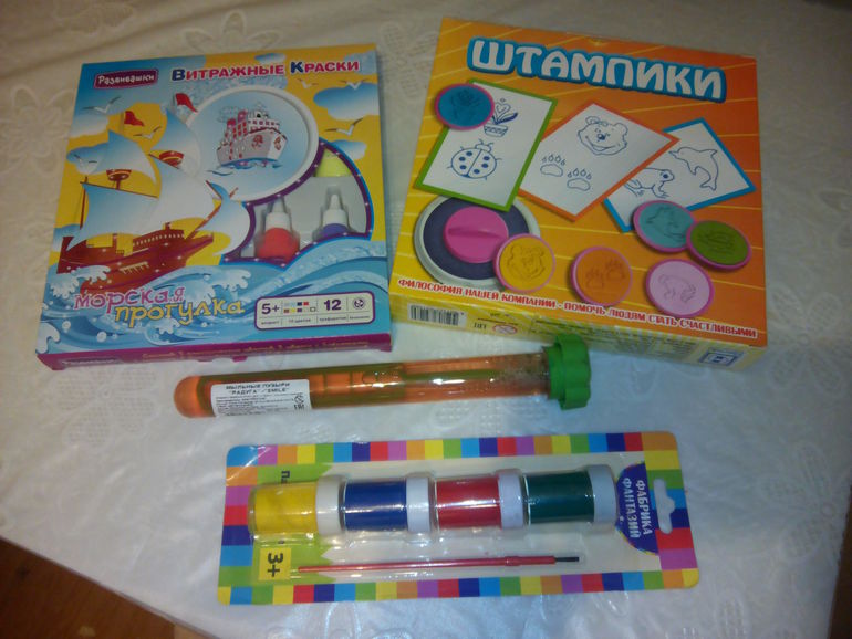 2) Витражные краски - написано с 5+ - но там трафарет - который и сейчас можно использовать (отдельно не нашла), да и краски - в общем попробуем, если рано - уберу или племяшке подарю)