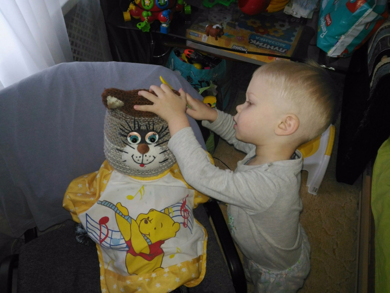 Довольный, улыбается, про тетю рассказывает, хвалю его. Умничка моя!