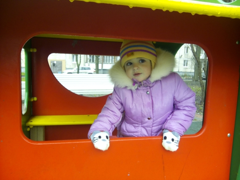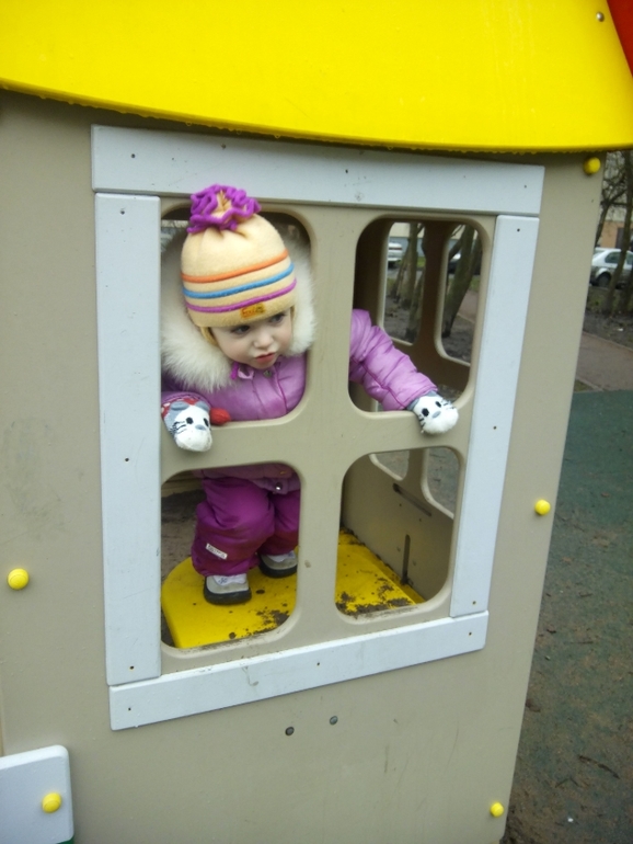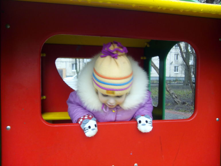 На площадке играет со всеми! И везде! Любит лазать! Обезьянка моя.