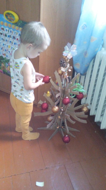А вот и наша елочка сделанная из картонной коробки. Сыну она очень нравится, ведь ее можно наряжать самому, не боясь уколоться.