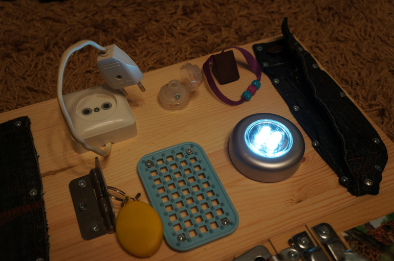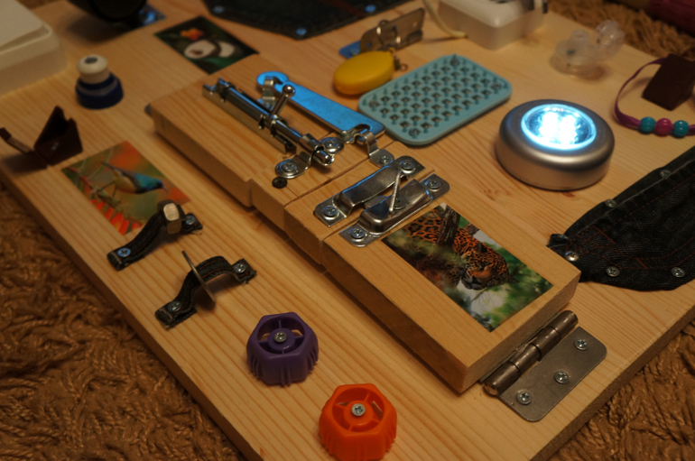 На нашей развивающей доске есть выключатели, разные закрывающиеся\открывающиеся и подвижные элементы, свет, разные виды замочков, молния и пуговица, карман (можно что-то положить), массажные иголочки (безопасные). Коричневые штуки открываются. Вообщем, нет ни одной неподвижной штуки.Главное, мастер все безопасно прикрутил на шурупы, оторвать ребенок не сможет.