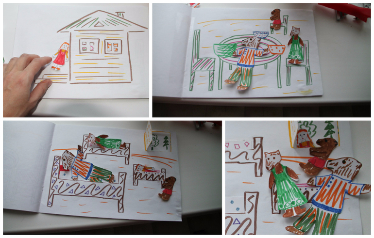 Поэтому со сказками, ему пока неинтересными, я знакомлю с помощью какого-нибудь интерактива. Недавно писала про "перекидушку" "Репку", а на прошлой неделе на ура пошли самодельные "Три медведя":