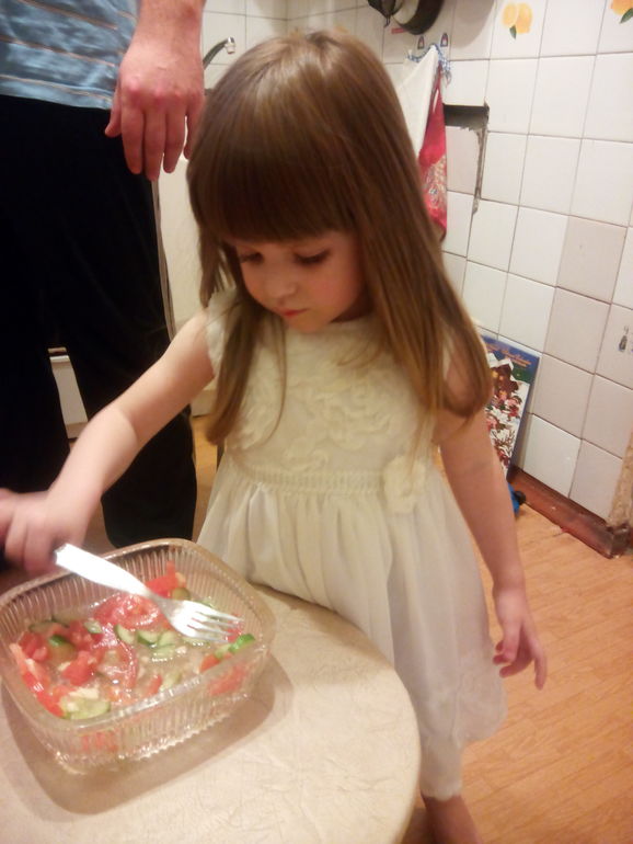 Папа на работе. Овощи сварены. Но почистить и приготовить салаты я не могу, Мишутка с утра с рук не слезал! Не знаю, что с ним такое)) В итоге - решила не нервничать, ждать папу с работы, а потом спокойно все делать)