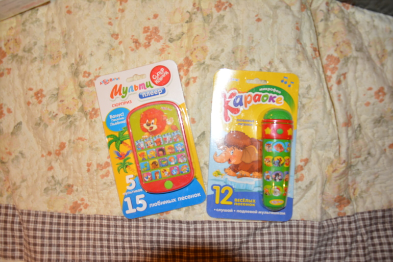 вот эти 2 музыкальные игрушки.Она поет песни,началась прорываться речь.Повторяет слова.Я в восторге и довольна как Слон.Хочу еще такие же купить ,но с другими мелодиями.Недорого!И столько удовольствия!