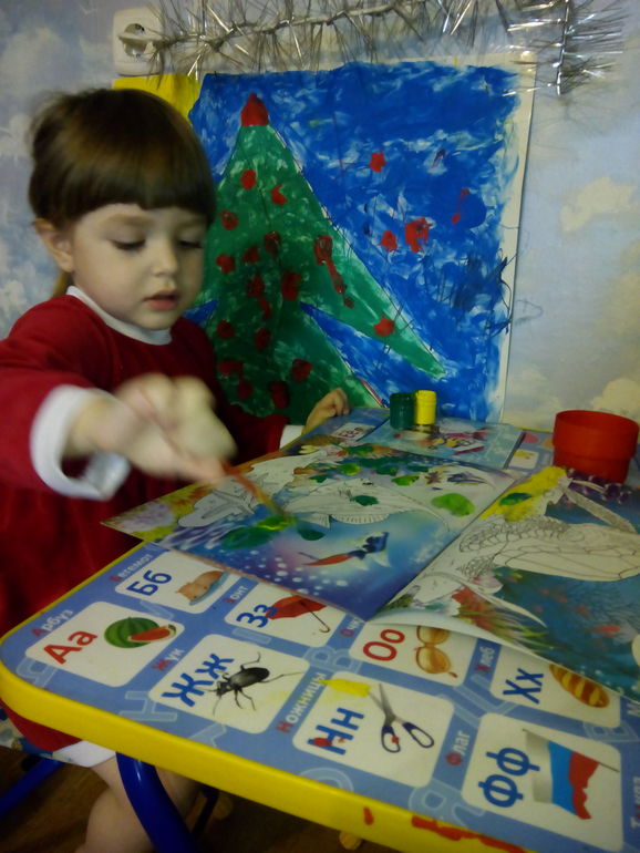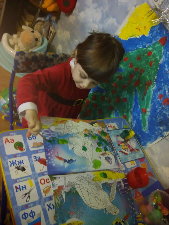 Наш фаворит сейчас - КРАСКИ и КИСТОЧКА. Сидит рисует. Очень нравиться. Стараемся, когда Мишутка спит, чтобы не лез к ней и они оба не перемазались. Раскрасок купила много и красок тоже, так что можно творить.