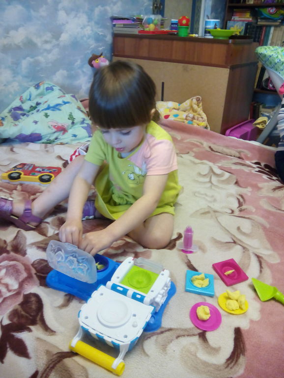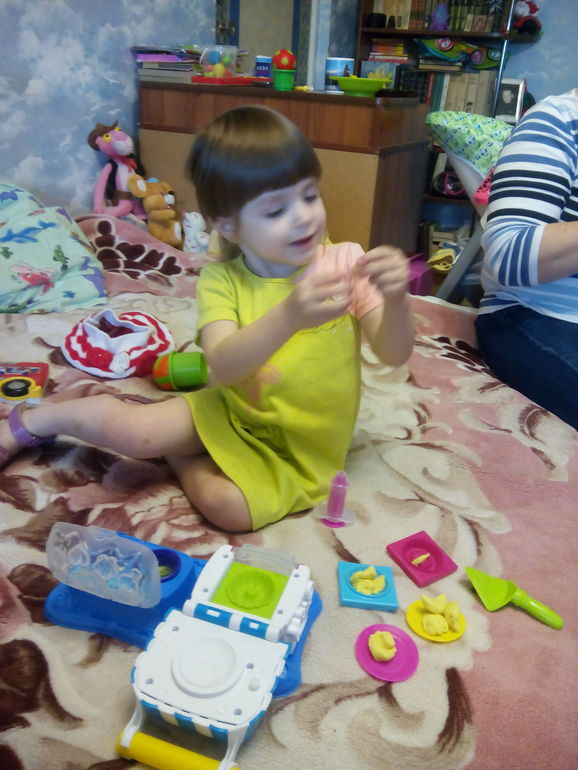 Приезжала подружка, подарила нам - плей-до мороженое. Такая вещь, девочки. столько формочек. Столько идей и красивых штучек. Единственное, не понравился - шприц, вообще не давит( Надо докупить будет наборчики и еще пластилина. Она его везде забывает, засыхает.
