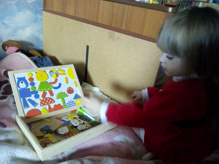 Когда Мишутка спит. Мы сидим на кухне. И там уже - пытаемся читать книжки, не в какую! Забирает у меня и листает, сама чего то рассказывает. Смотрим журналы Пеппа, ну и мамины Гламур и Космо. Там же - играем в магнитные фигурки - очень нравиться, довольна покупкой. Киндеры-игрушки идут в ход. В общем - развиваемся, как можем и хочет доча.