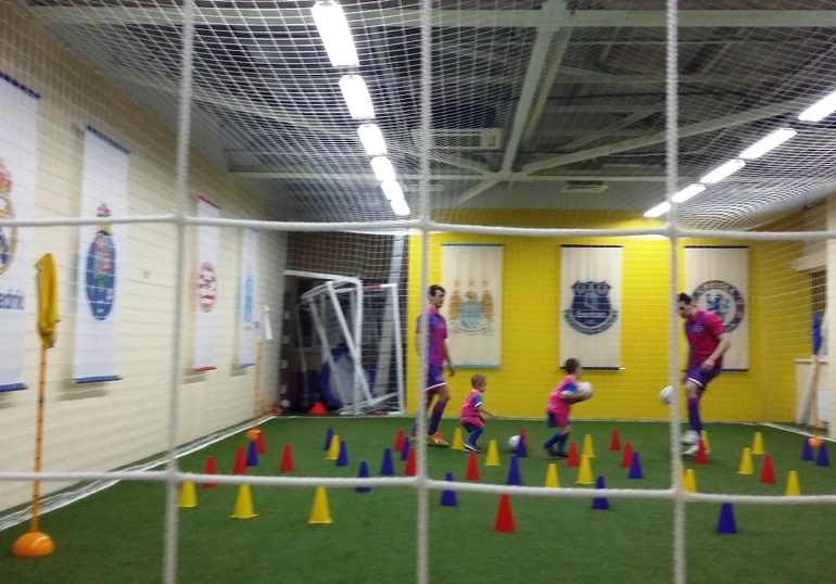 Само занятие проходило в специально оборудованном зале, родители сидели за сеткой в метре от "поля". На занятии нас было всего двое: наш деть и мальчик лет 5. Два тренера-затейника, которые быстро нашли общий язык с детьми. Занятия проходили со сказками-прибаутками, загадками и пр., чередовались физические игры и отдых. Сын увлеченно играл в футбол бегал по территории поля и выполнял задания. В конце только два громогласных тренера совсем уж сильно вошли в роль сказочников и переусердствовали, изображая пчелок: деть испугался и расплакался, остаток занятия держался особняком, в игре не участвовал: ему выделили отдельные ворота, он сам в них мячи закатывал.