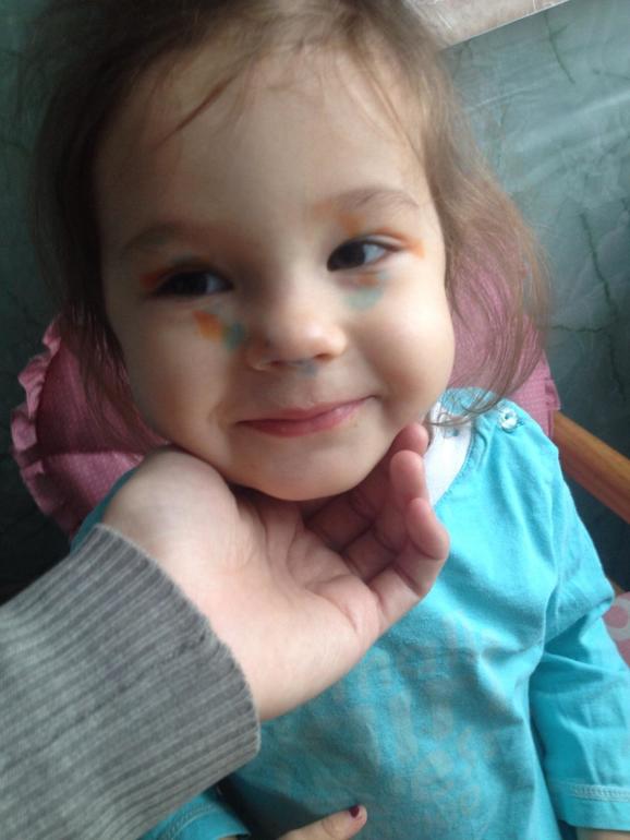 А это купили ей фламастеры (слава богу они были детские,а то не представляю как смывали бы), она накрасилась, видать увидела как красится мама и тоже решила соответствовать)