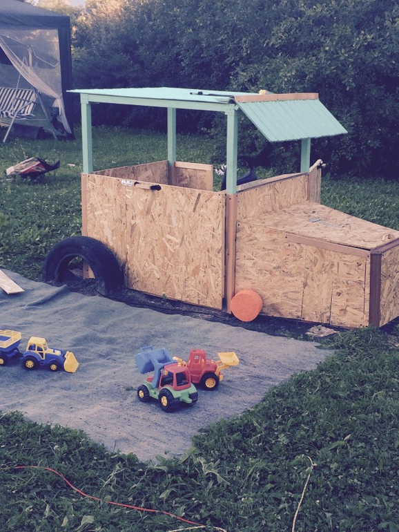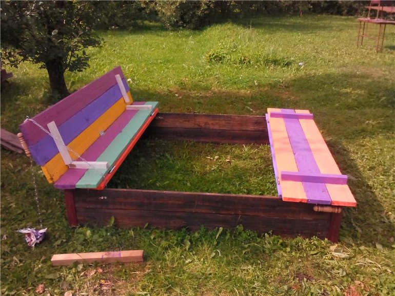 Песочницу муж сам сколотил из досок, с крышкой из фанеры.