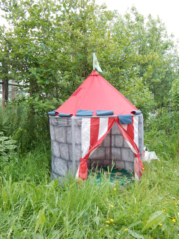 У нас дом дочкиного прадедушки. Есть небольшой газон рядом с домом огорожен густым малинником, там же собачья будка в углу. Песочницу муж сколотил из досок, кошек гоняет собака. Большие садовые качели. Выносим детские палатки с тунелем. Стена забора отдана под рисование мелками. К лету купим батут еще. И есть у нас бассейн с горкой и фонтанчиком, вся окрестная малышня обливалась слезами, но играли там кроме моей дочери только две ее подруги. Моя ма очень следит за этим, и когда уезжаем - все убираем