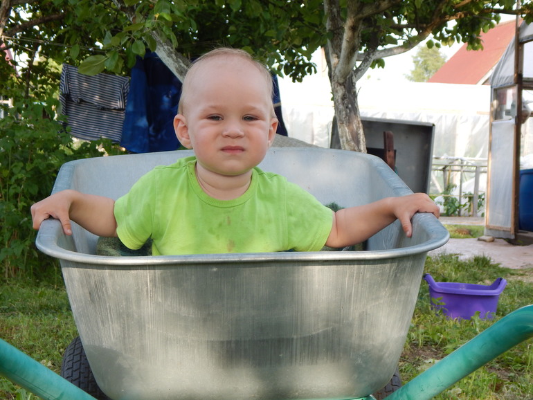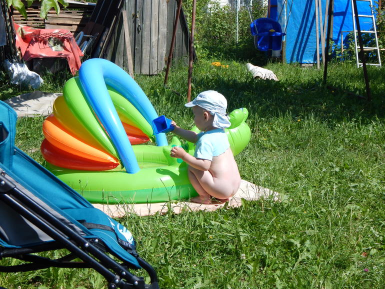 Пластиковую песочницу купили сначала, но в итоге стали набирать туда воду и использовать как очень мелкий бассейн. Бассейн надувной у нас тоже есть, но пользоваться им труднее. Дело в том, что у нас не слишком жаркое лето и колодезная вода совершенно не успевает прогреваться. Со вчерашнего дня я не люблю воду оставлять, потому что в ней плавают мошки, песочек, всякая пыль-хрень (даже если накрывать на ночь, все равно за день налетает мусор). А в пластиковой ракушке воды мало, и я каждое утро набираю из колодца, и доливаю еще ведро кипятка или пару чайников, чтобы вода уже утром была теплая. Для 1,5 лет самое то: сидит ребенок по пояс в воде, может лечь побултыхаться, играет с игрушками, и не страшно, что захлебнется. И мыть легко (в отличие от надувного бассейна). И перемещать с места на место можно в течение дня (то на солнышко, чтобы вода согрелась, то в тенек, чтобы дети не получили солнечный удар и не обгорели)