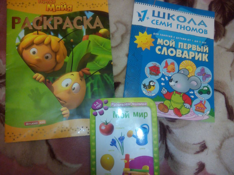 Первое фото - что нам подарили - Большую раскраску Майя, Книжка Школа Семь Гномов и Развивающую книжку с картинками - Мой Мир.