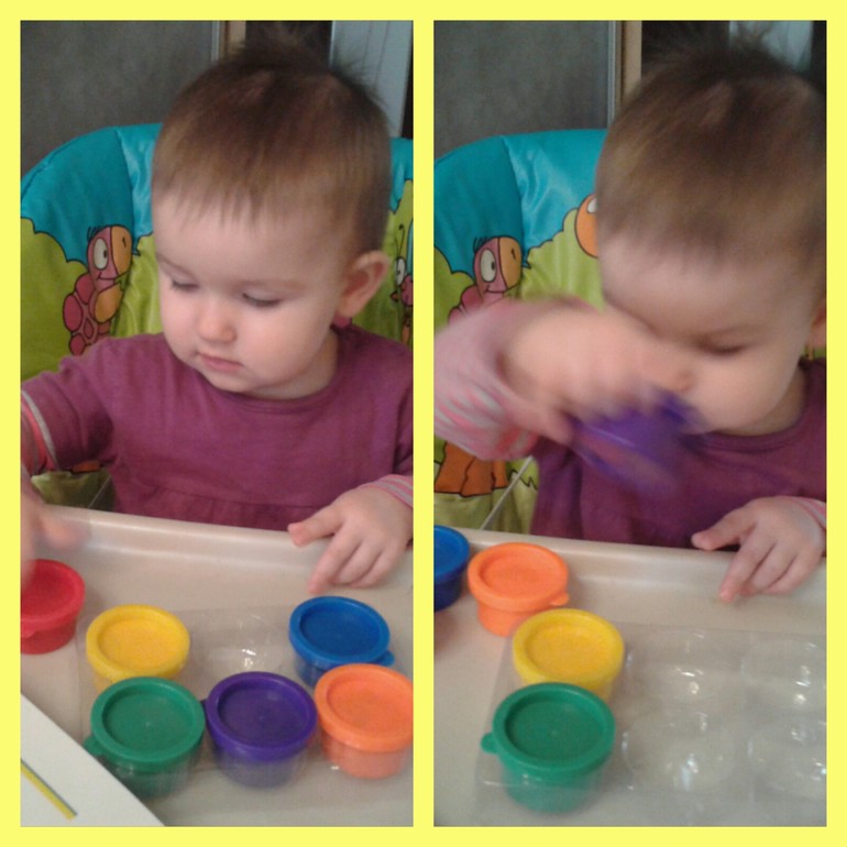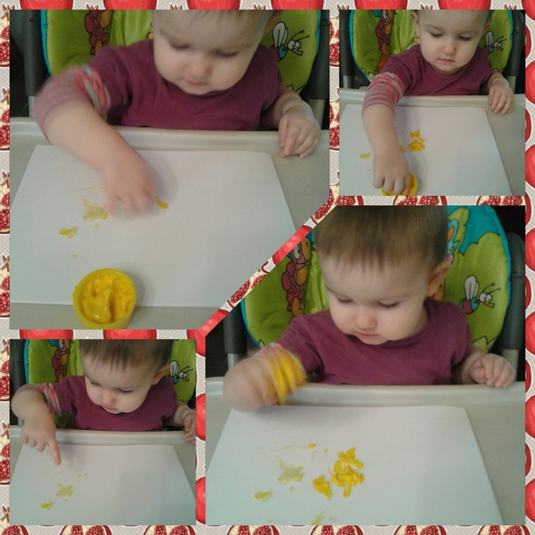 сначала я решила открыть ей желтую краску и она не долго думая начала доставать с коробочки краску маленькими порциями на бумагу