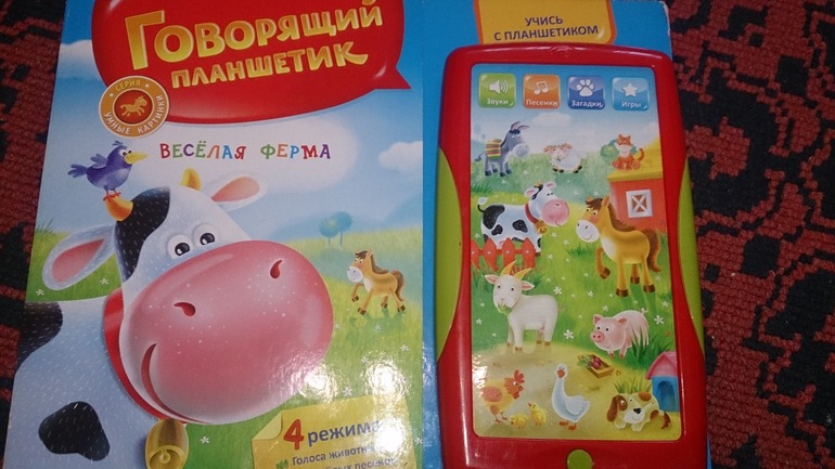 5. Говорящий планшетик. Я в восторге от этой книги. Картинки яркие, красочные, внутри почти к каждому животному стихи короткие. Сам планшет чудо, и прослужит нам очень долго. Там 4 режима. Звуки и названия животных, песни животных, загадки про животных, и игры (тоже что то типо загадок, кадется 4 различных игры). Пока мы просто слушаем название, звуки животных и их песни. Ребёнку очень нравится нажимать на них