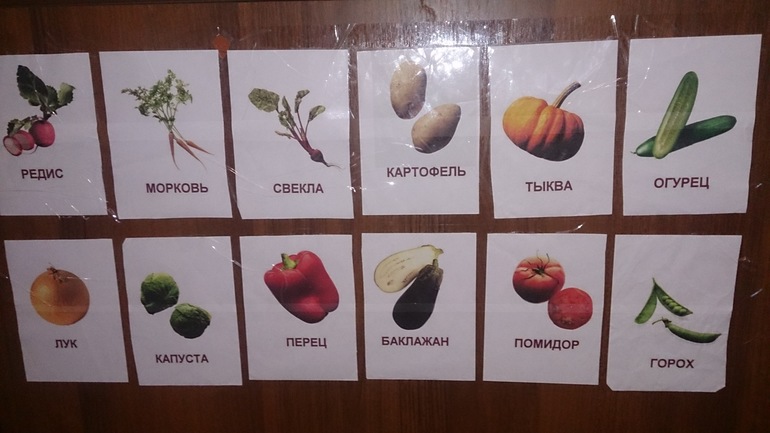 6. По всему дому у нас расклеяны картинки с овощами, фруктами, животными и просто предметами. В общей сложности 48 карточек. Здесь просто когда сын к ним подходит, показывает пальцем, я озвучиваю