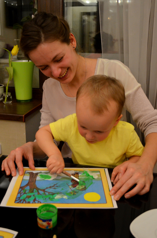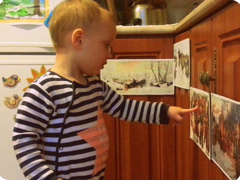 Вечер прошел чудесно! Мне кажется, таким и должно быть веселье на Масленицу для малышей: проходить в кругу друзей, быть насыщенным ненавязчивыми деталями и простыми забавами. Ведь массовые гуляния пока не могут быть оценены по достоинству, ребенок может переутомиться и перевозбудиться. А мы просто танцевали с детьми под Римского-Корсакого и Чайковского, просто (как модный виммель) рассматривали репродукции, просто поиграли с маленькими Масленицами, просто сделали аппликацию на тему весны и просто лакомились блинами.